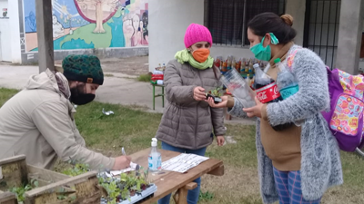 Desde allí orientan a los niños y niñas que forman parte de ese taller pero también reciben consultas de los vecinos a quienes se viene entregando semilas y plantines, junto con los bolsones de mercadería.